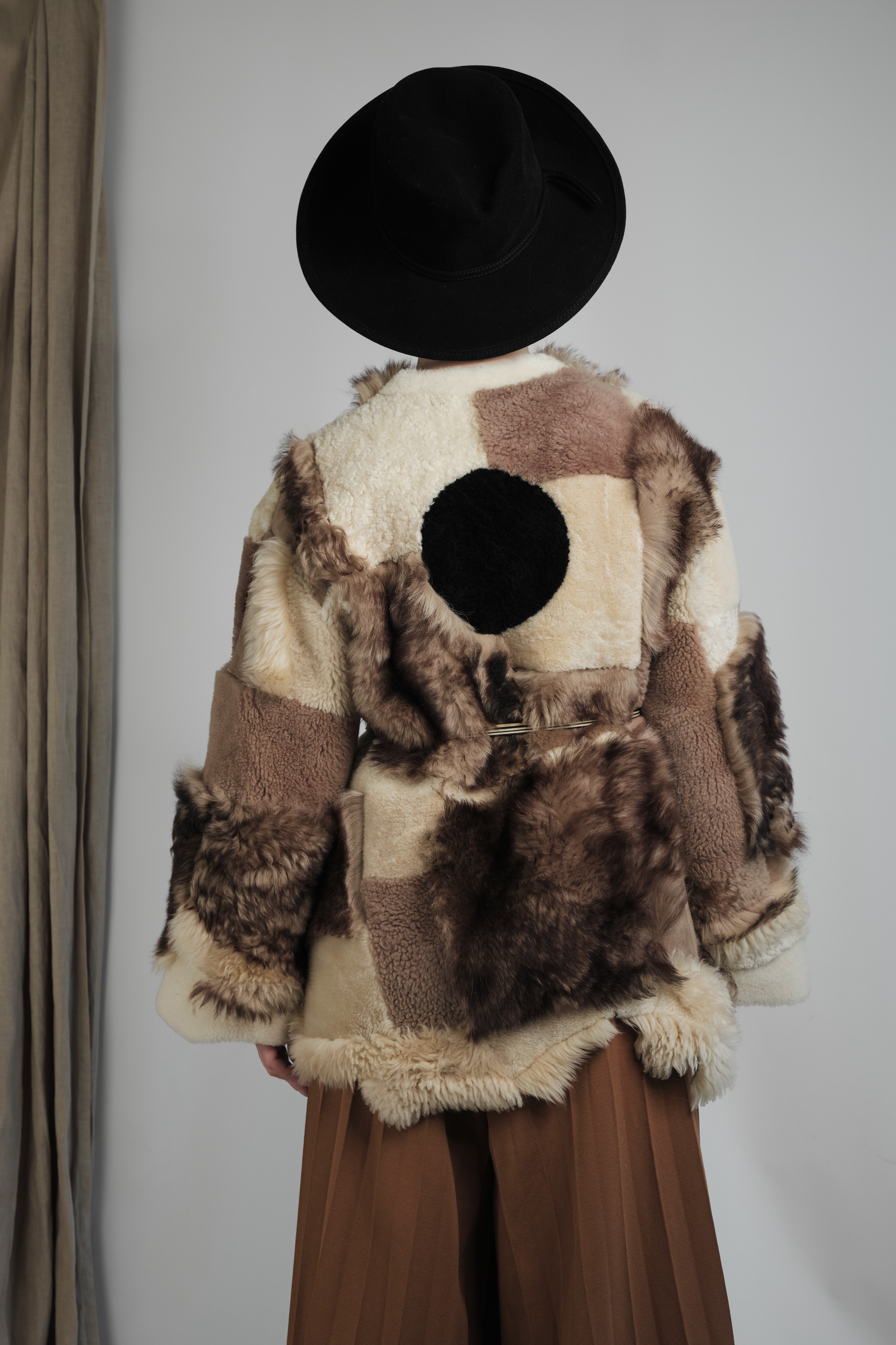 Upcycled vintage sheepskin kimono coat with circle intarsia